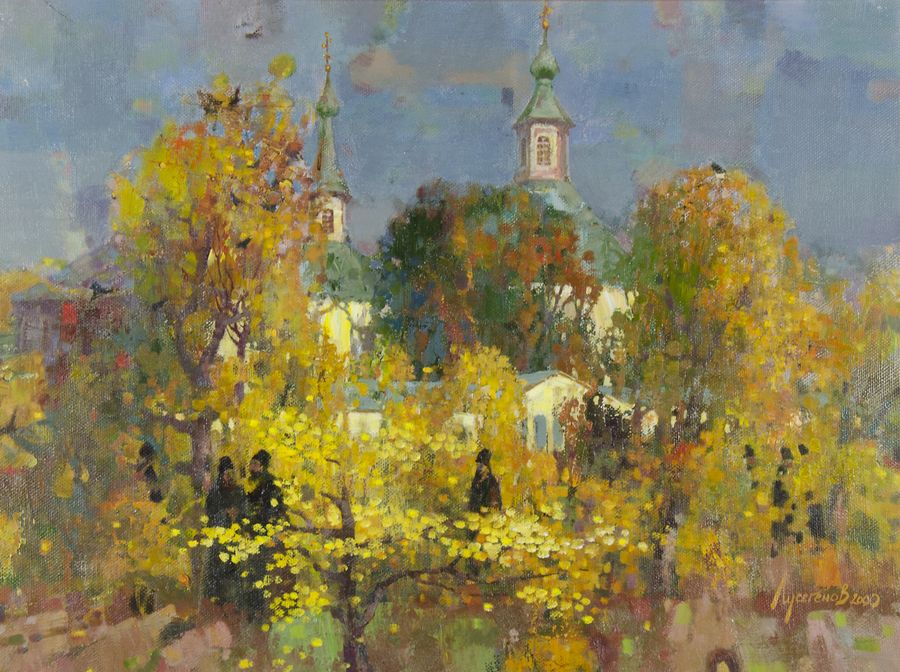 Pittore russo contemporaneo "Alberi in autunno" cm. 60x80 - olio su tela Firmato b. a d. e datato 2000.
