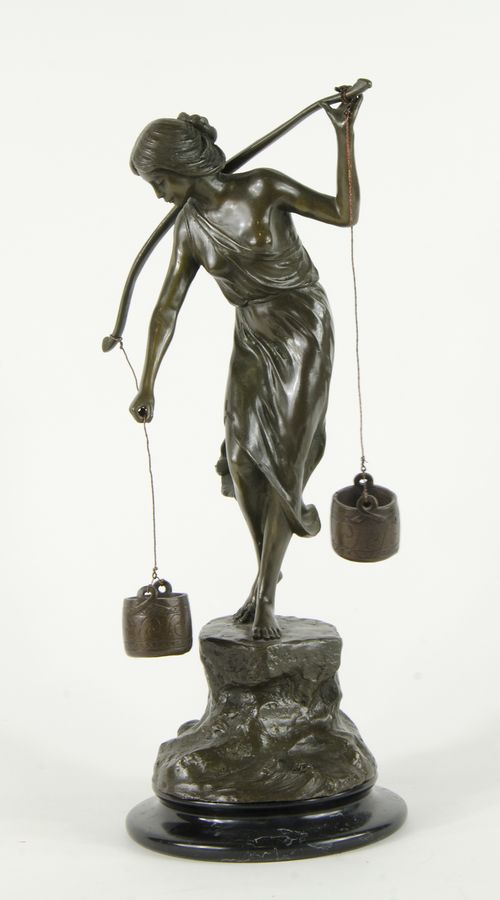 Karl P. Kowalczewsky 1876-1927 "Portatrice d'acqua" h. tot cm. 43 - scultura in bronzo a patina scura su base in marmo Firma incisa sul fianco.