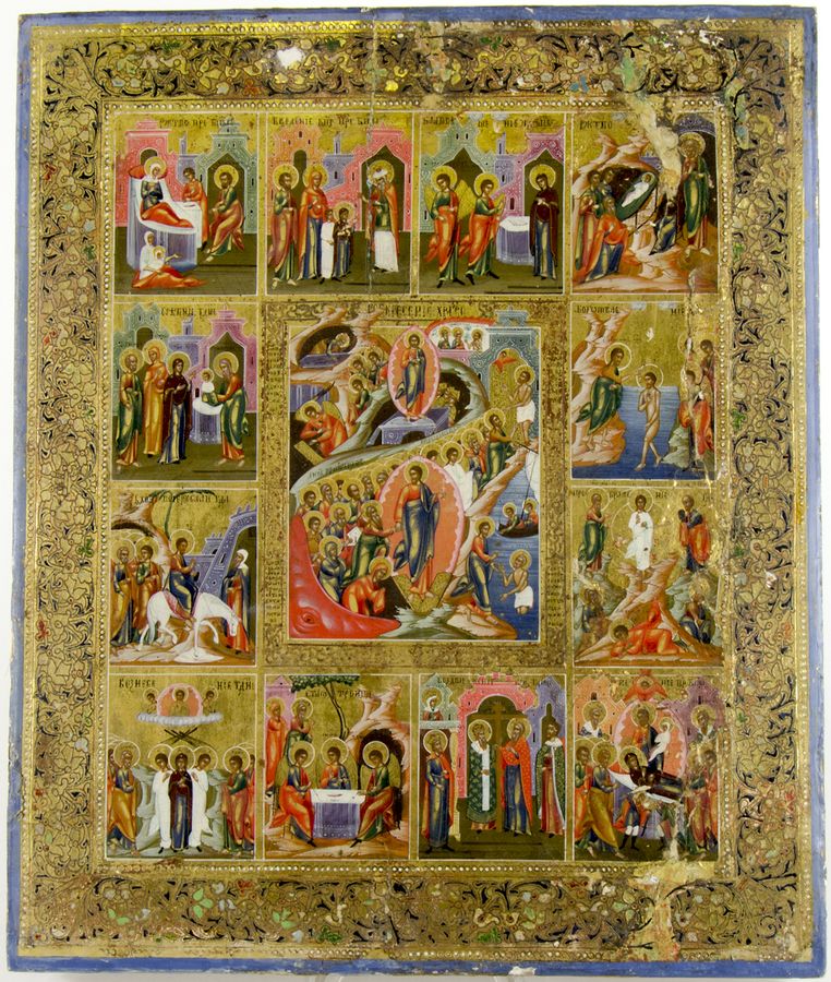 Icona dipinta su tavola raffigurante le 12 feste. cm. 45x38.