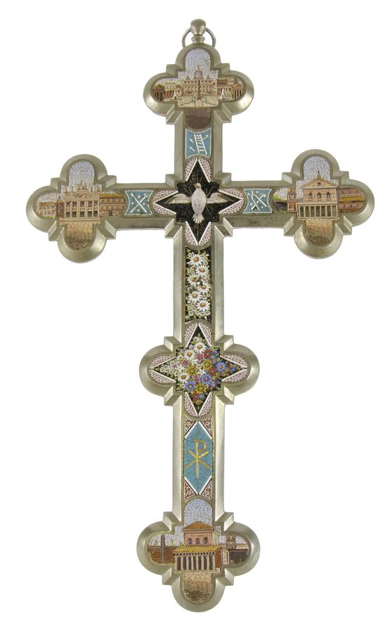 Grande croce in metallo fienemente lavorata a micromosaico raffigurante Piazza San Pietro e altre vedute. H. cm. 40.