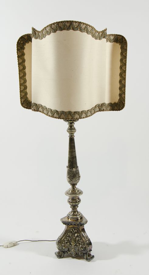 Lotto 151 | Portacero in rame argentato trasformato a lampada con paralume. H. tot cm. 102.