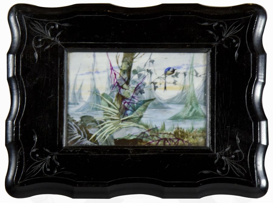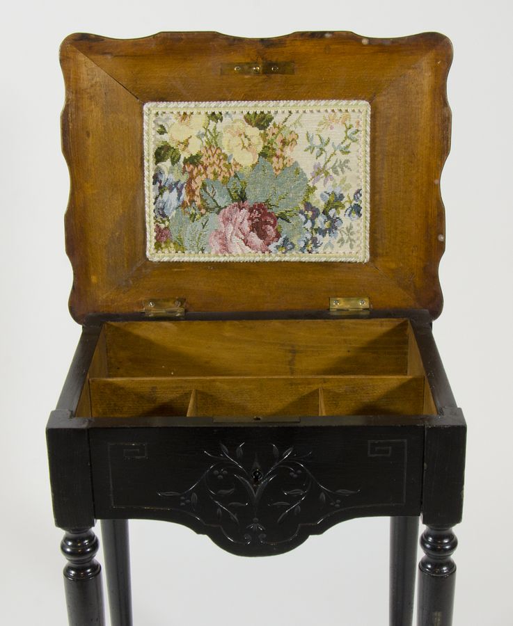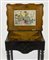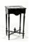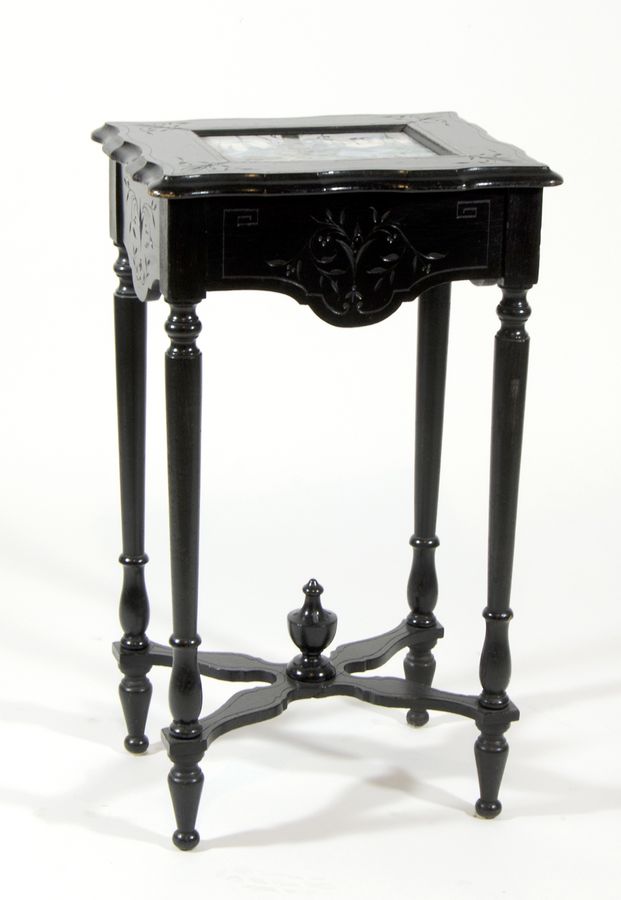 Tavolino da lavoro in legno nero, sul piano una piastra in porcellana policroma.