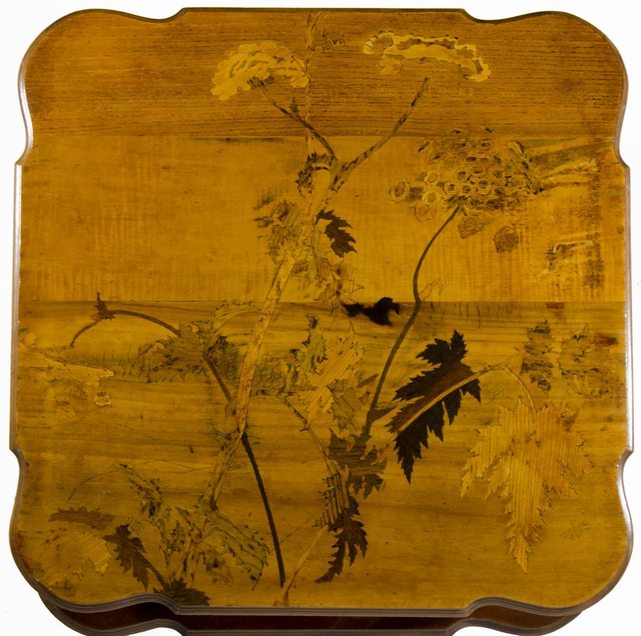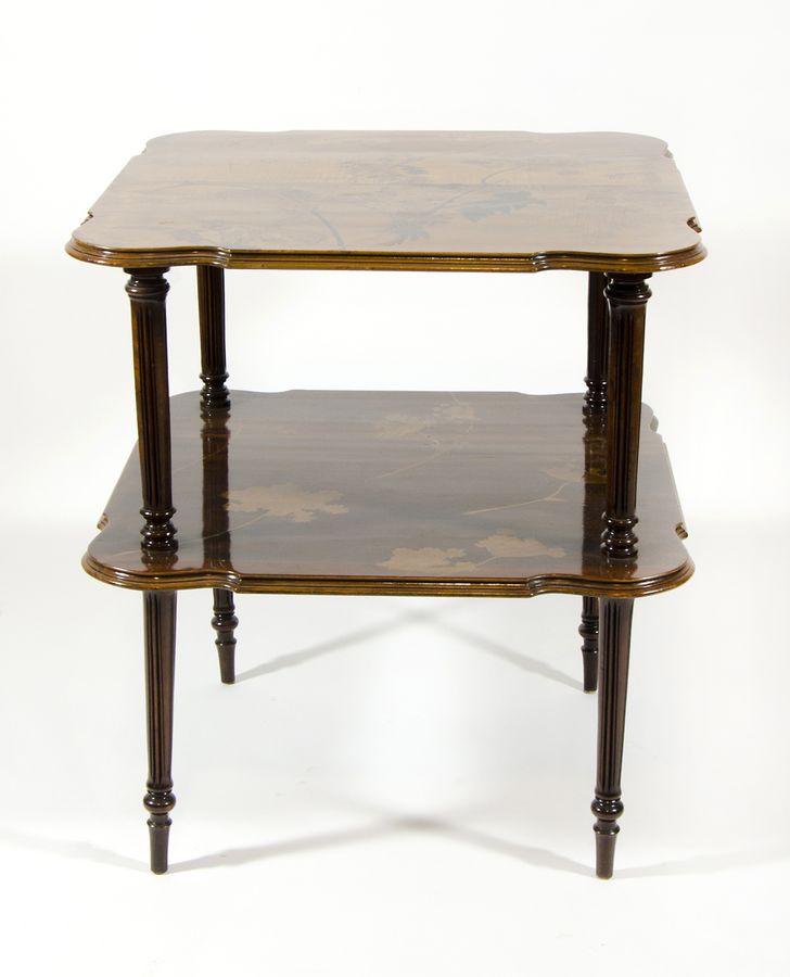 Emile Gallè 1846-1904 Tavolo quadrato a due ripiani intarsiato in legni vari...