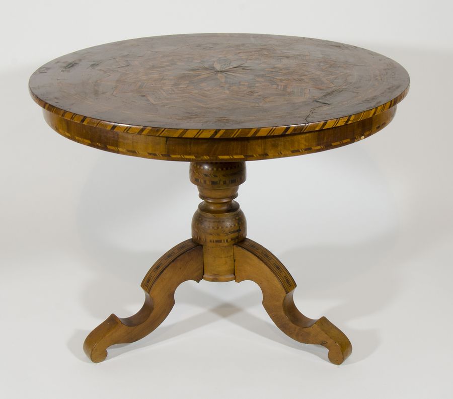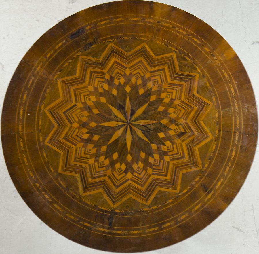 Tavolo "sorrentino" rotondo in legno con intarsi in legni vari. H. cm. 69,...