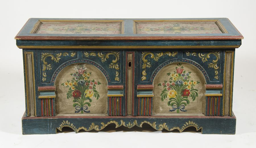 Cassapanca tirolese in legno dipinto a motivi floreali. cm. 57x120x48.