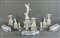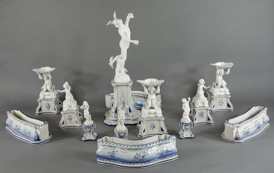 Ginori: grande centrotavola composto da 13 elementi in bisquit e porcellana bianca e blu. Marcati sotto la base.