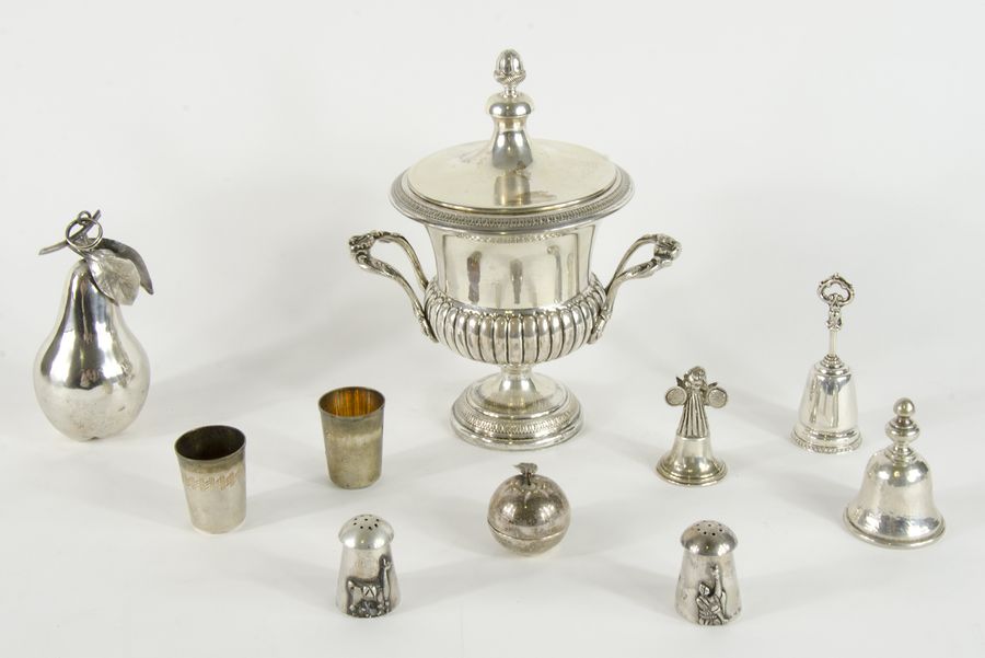 Lotto di vari oggetti in argento tra cui coppa e campanellini. Gr. 1060.