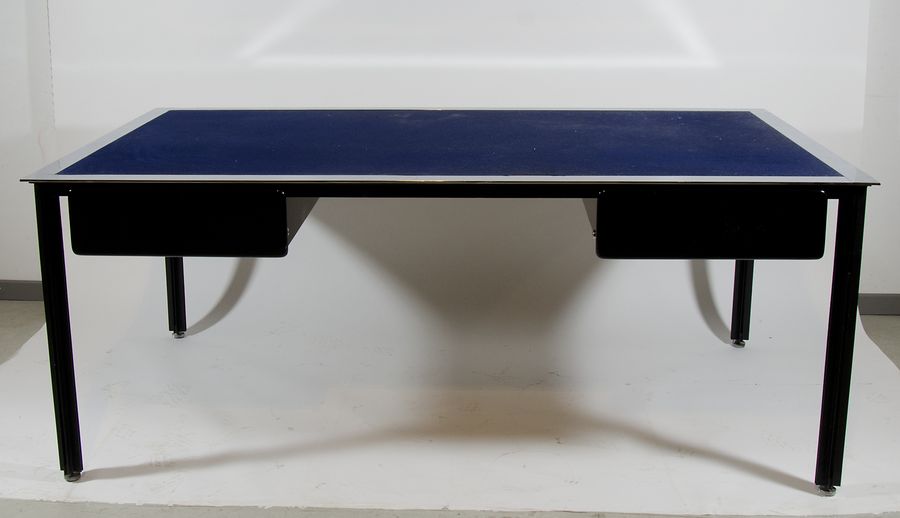 Azucena: scrivania in metallo e legno con 4 cassetti. Disegno di L. Caccia Dominioni.1972. cm. 76x190x110. La scrivania è accompagnata dalla poltrona Frau modello Cavour.