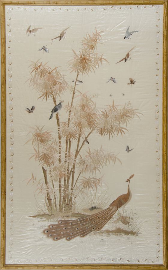 Grande stoffa ricamata raffigurante paesaggio orientale. Inizio XX secolo....