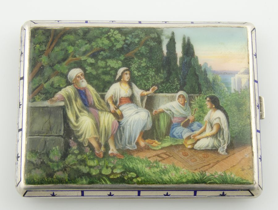 Scatoletta portasigarette in argento a smalti policromi raffigurante scena...