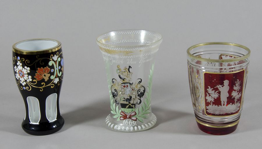 Lotto di 3 bicchieri in vetro a decori policromi.