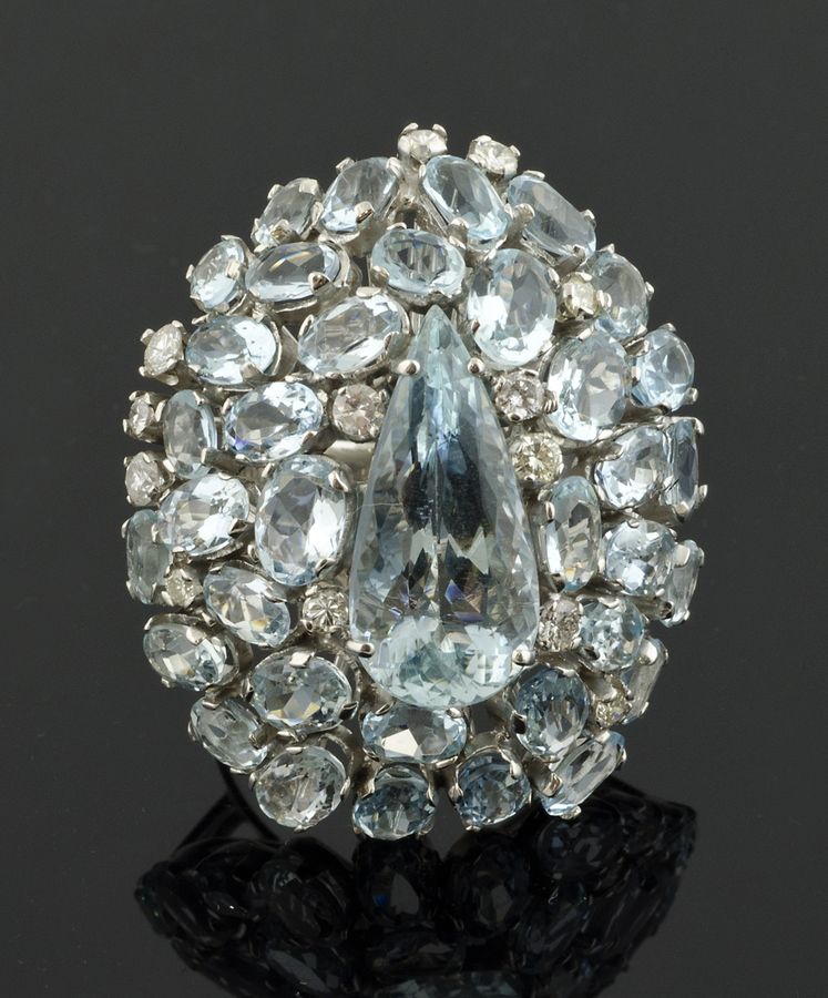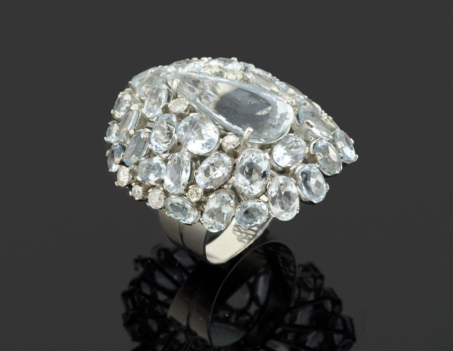 Anello in oro bianco a cupola composto interamente da acquamarine e diamantitaglio brillante