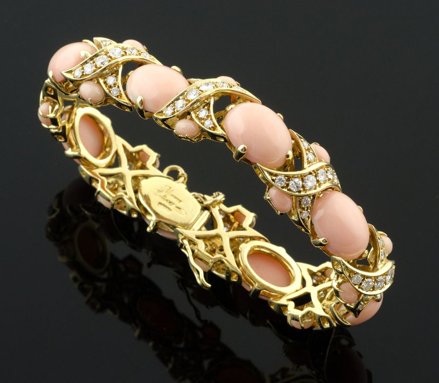 Bracciale in oro giallo composto da ovali di corallo "pelle d'angelo" intervallati da fiocchi di diamanti. gr. tot 52,2.