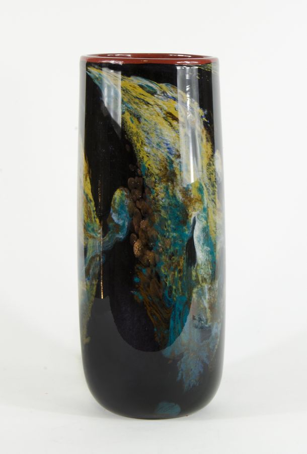 Grande vaso in vetro di forma cilindrica con decori policromi. H. cm. 45.