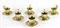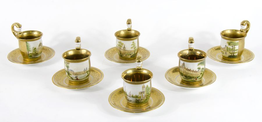 Serie di 6 tazze con piattini in porcellana dorata e decorate con vedute al centro, manici con teste leonine.
