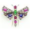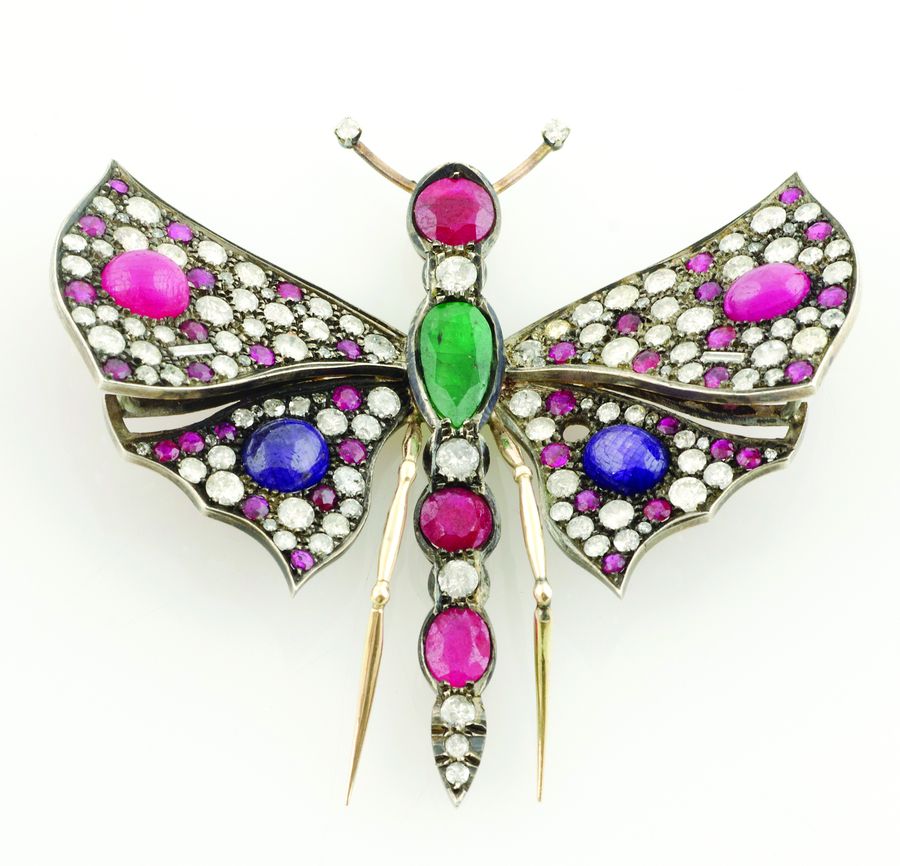 Spilla in oro rosa a forma di farfalla con rubini, rubini cabochon, ametiste cabochon, smeraldo ovale e diamanti taglio antico, lungh cm 7