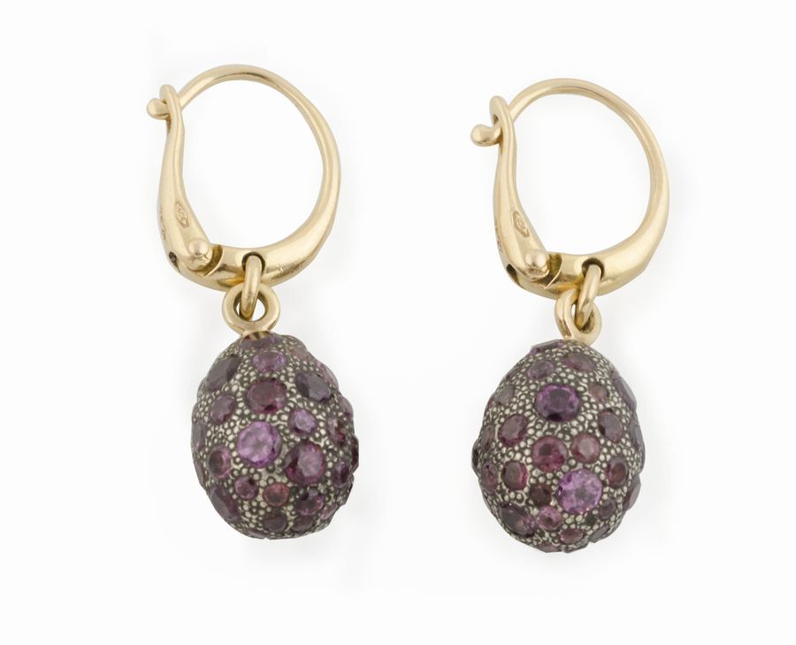 Orecchini pendenti Pomellato a monachella in oro rosa con pendente a forma di goccia in argento brunito e granati, firmati.