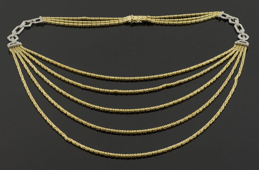 Collana a 3 fili in oro giallo intervallata da elementi in oro bianco con brillantini. Gr. tot 63,7.