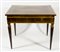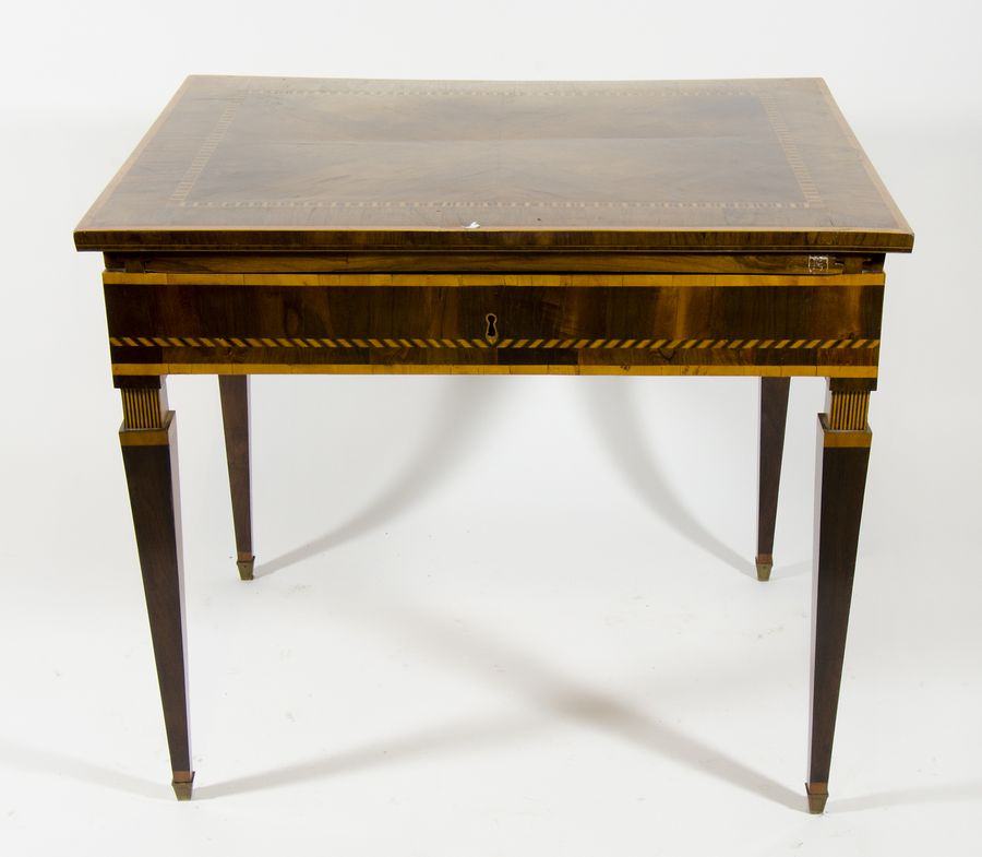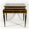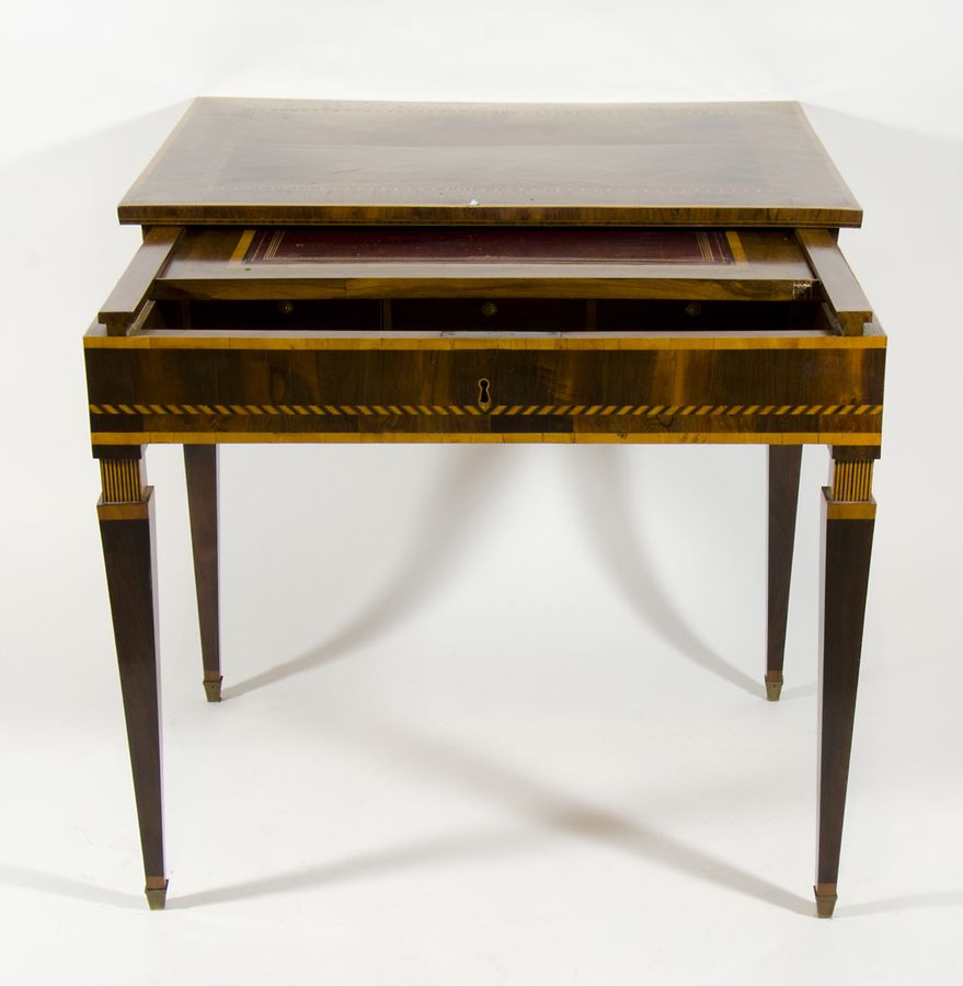 Tavolo/scrittoio in legno riccamente e finemente intarsiato in legni vari a filettature, piano scorrevole con all'interno 3 piccoli cassetti e ripiano in cuoio. XIX secolo. cm. 78x91x71.