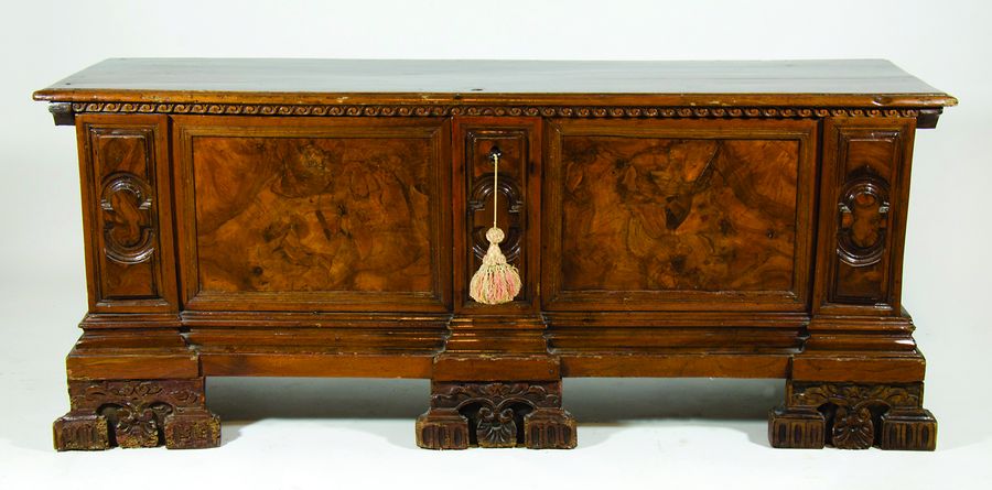 Cassapanca in legno con fronte a formelle scolpite. cm. 68x170x52.