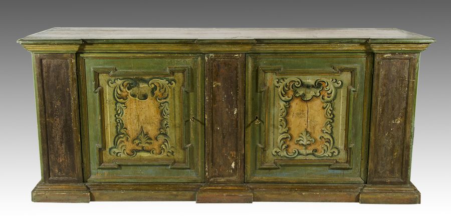 Grande credenza a 2 ante in legno finemente dipinto a motivi floreali. Friuli(?), XVIII secolo. cm. 90x215x66.