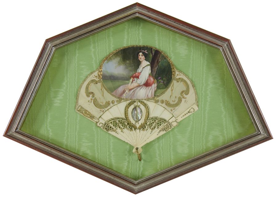 Ventaglio di forma a palloncino dipinto con figura di giovane donna con cornamusa, stecche in osso e madreperla, entro teca Spagna, manifattura Vendrel, 1890 circa. Lung tot cm. 60.