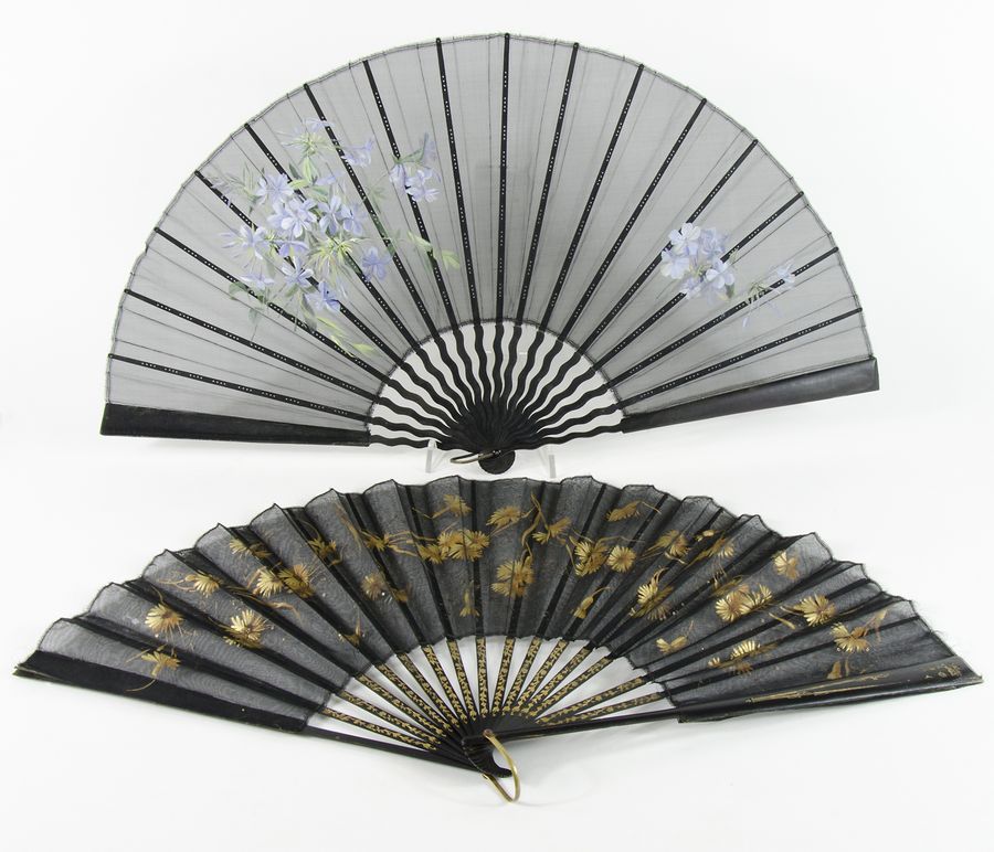 Lotto 255 | Lotto di 2 ventagli da teatro con stecche in legno nero e tela e stoffa...