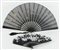 Lotto di 2 ventagli da teatro con stecche in legno nero inciso e tela e...