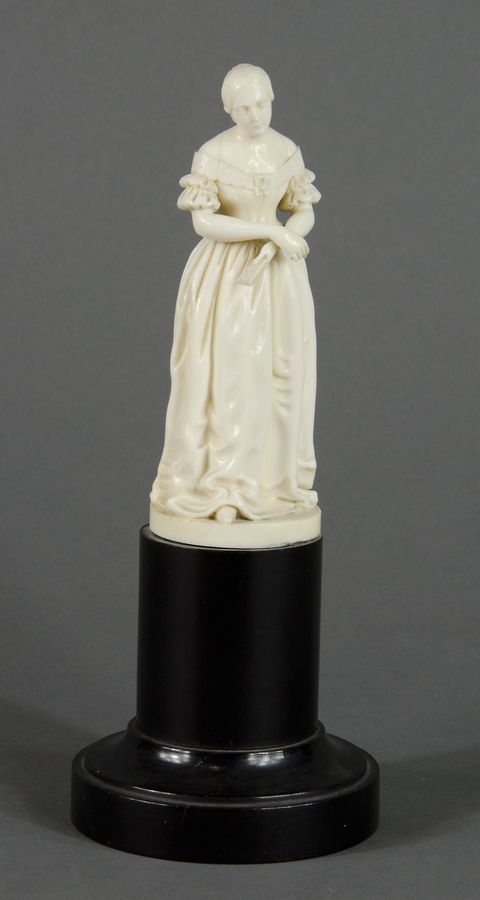 Scultura in avorio finemente scolpita raffigurante gentildonna, su base in legno. Europa, XIX secolo. H. tot cm. 23.