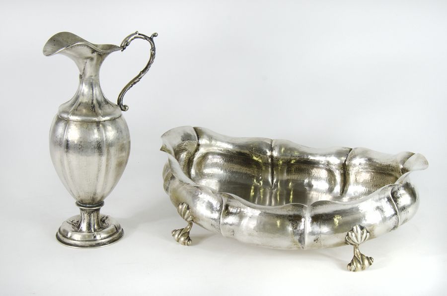 Lotto in argento composto da grande centrotavola ovale e brocca con manico. Gr. tot 1400.