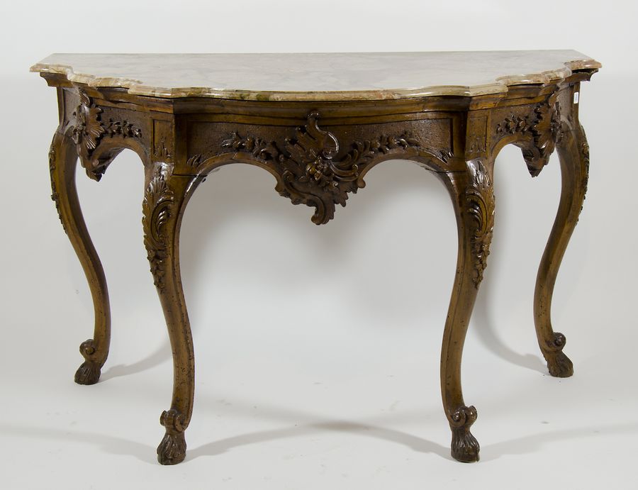 Grande consolle in legno riccamente scolpita a volute floreali, piano sagomato in marmo. cm. 86x132x75.