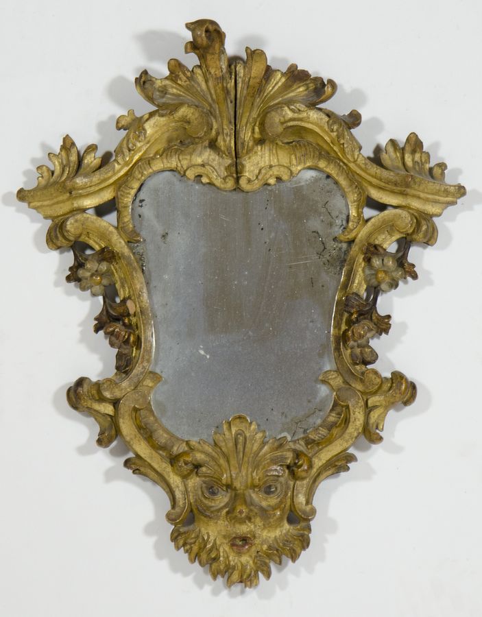 Specchiera sagomata in legno dorato scolpito. cm. 49x40.