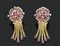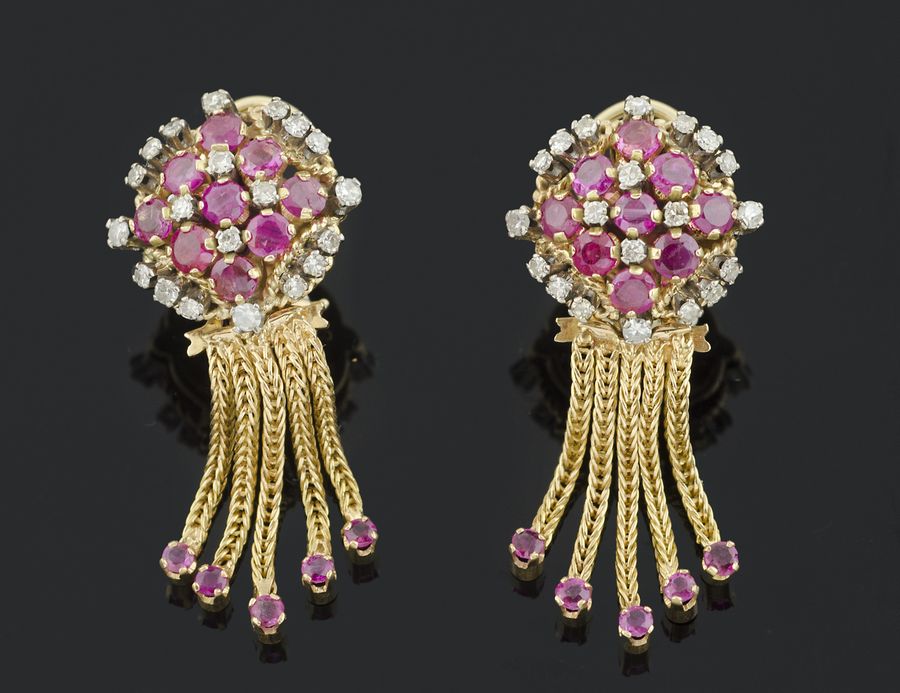 Orecchini in oro giallo composti da parte superiore forma rotonda ricoperta da diamanti e rubini, parte inferiore 5 pendenti in oro giallo con finale piccoli rubini