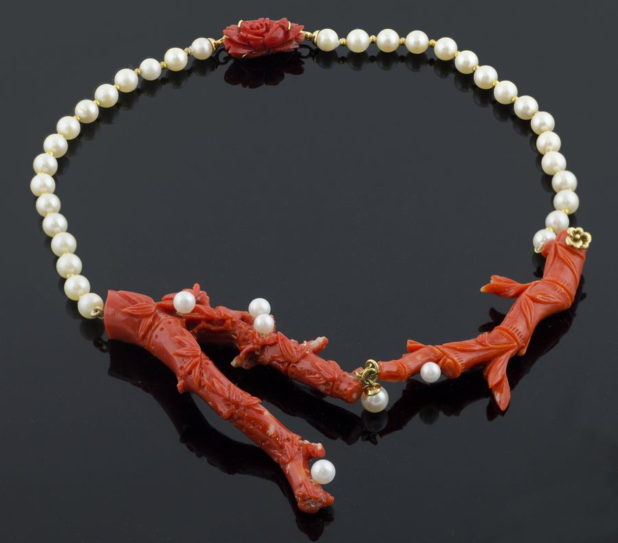 Collana ad un filo di perle Akoya di mm 7-7,5 con parte centrale in corallo rosso mediterraneo inciso a bambu con decori in perle e oro giallo, chiusura in corallo rosso inciso a forma di rosa
