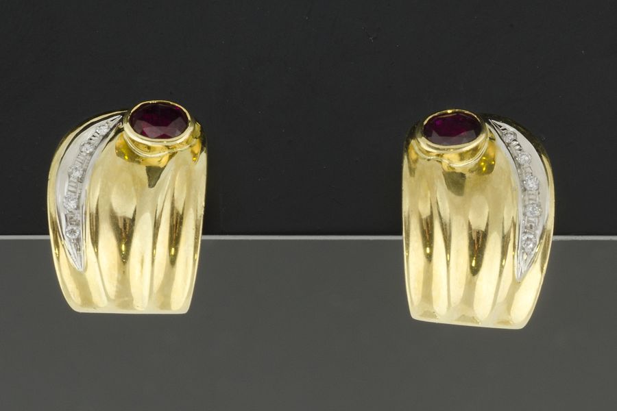 Orecchini in oro giallo e bianco con diamanti taglio brillante e rubino taglio ovale