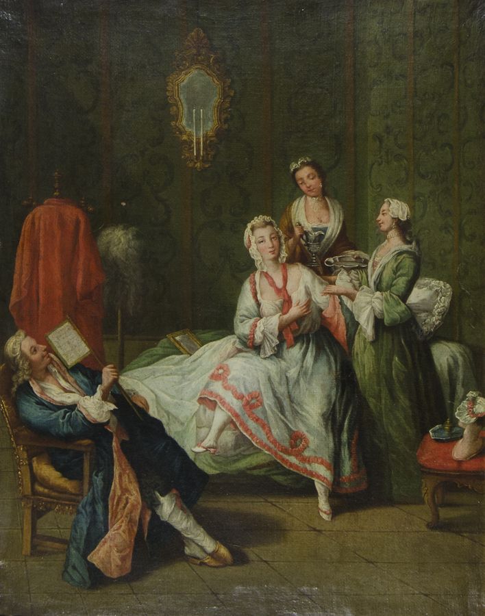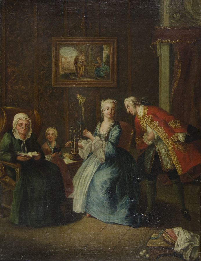 Maestro veneto del XVIII secolo Lotto di 2 oli su tela foderata, cm. 62x48: a) "La dichiarazione" b) "Preparativi per il ballo" Su questi dipinti è stata avanzata l'attribuzione al Maestro dei riflessi operante a Venezia nel XVIII secolo.