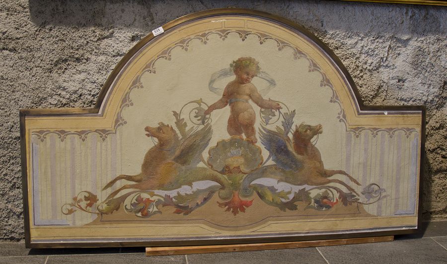 Pittore del XIX secolo "Putto con figure alate" cm. 85x157 - pittura murale taglio a lunetta