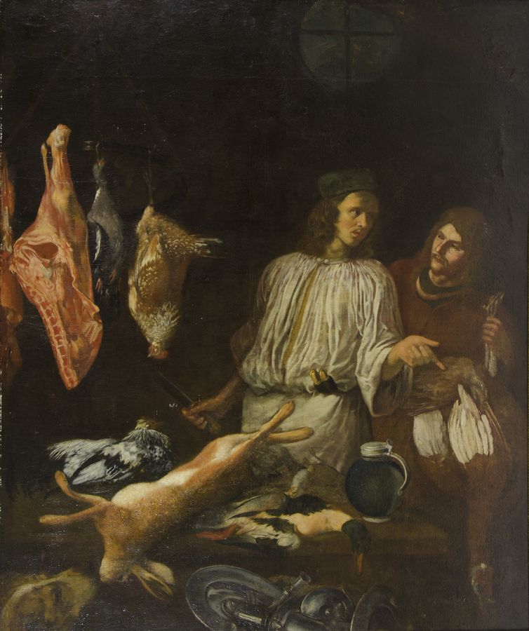 Maestro fiammingo operante a Genova nel XVII secolo "Scena di cucina" cm. 190x160 - olio su tela foderata Il dipinto presenta al retro la scritta Carlo Cignani 1679.