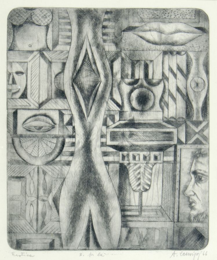 Avgust Cernigoj Trieste 1898-Sesana 1985 "Erotica" cm. 30x30 - incisione Firmato b. a d. e datato '66, Prova d'Artista.