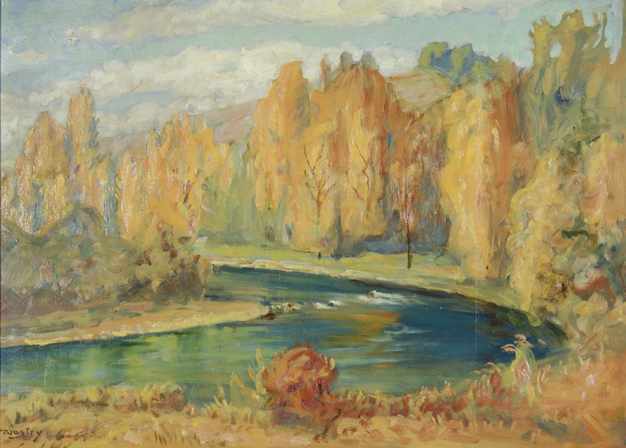Carlo Wostry Trieste 1865-1943 "Foci del Timavo" cm. 58x80 - olio su cartone Firmato b. a s. Al retro etichetta con titolo e data.