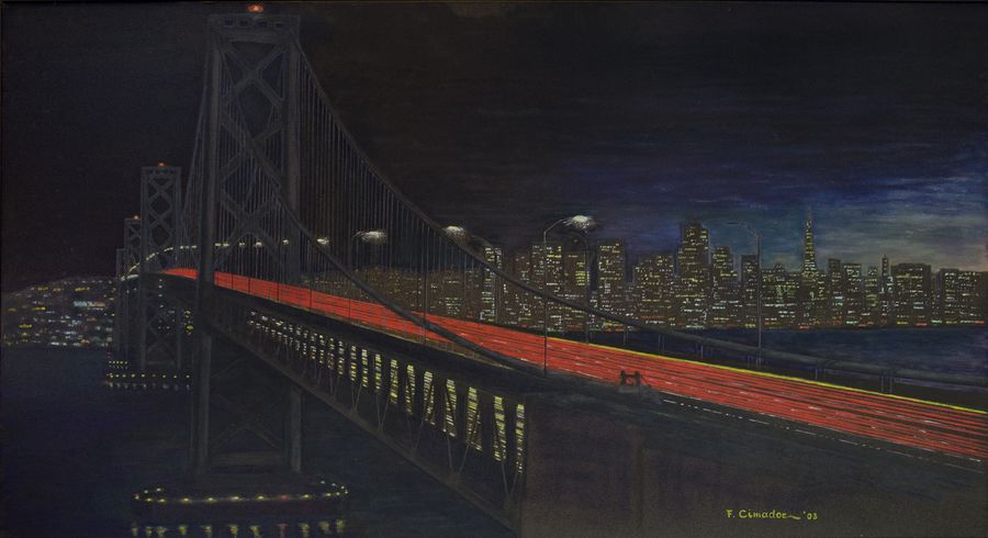 Flavio Cimador Trieste 1940 "Bagliori notturni" cm. 85x143 - olio su compensato Firmato b. a d. e datato '03.