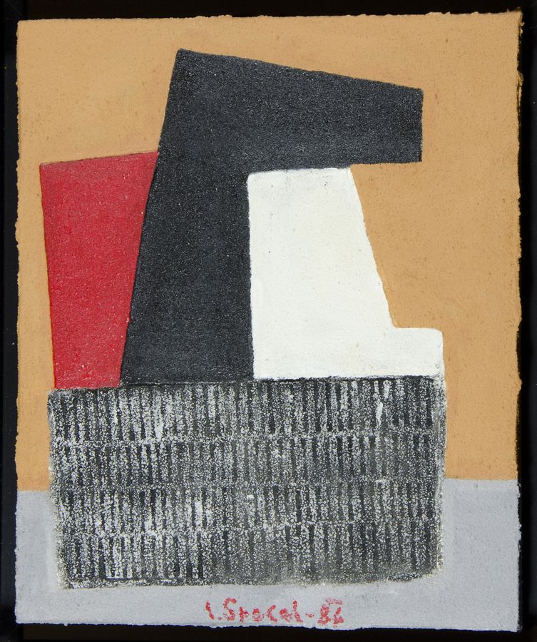 Luigi Spacal Trieste 1908-2000 "Composizione" cm. 30x25 - tecnica mista su tavola Firmato b. al centro e datato '86. Autentica su fotografia di M. Spacal con timbro Gallertia Nuova Artesegno Udine.