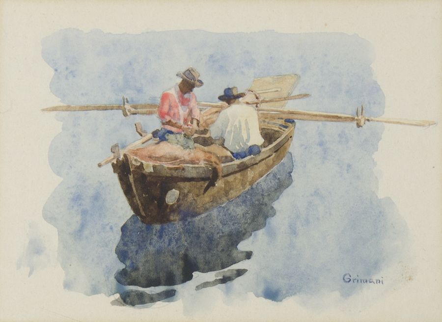 Guido Grimani Trieste 1871-1933 "Barchetta con pescatori" cm. 12x16 - acquerello su carta Firmato b. a d.