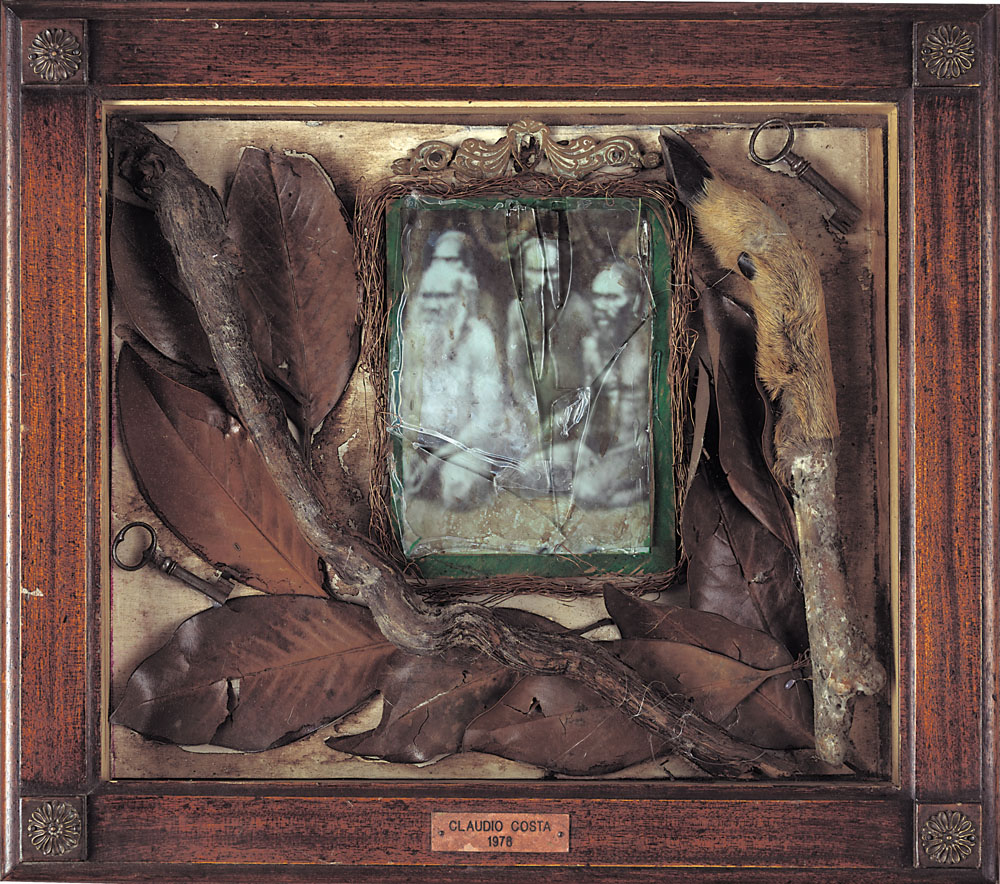 CLAUDIO COSTA Tirana (Albania) 22/06/1942 - Genova 1995 - Senza titolo, 1978, tecnica mista, legno, foglie, vetro, rame e metallo su tavola cm. 36,5x42,5; firma, anno e timbro della Galleria Rinaldo Rotta (GE) al retro.