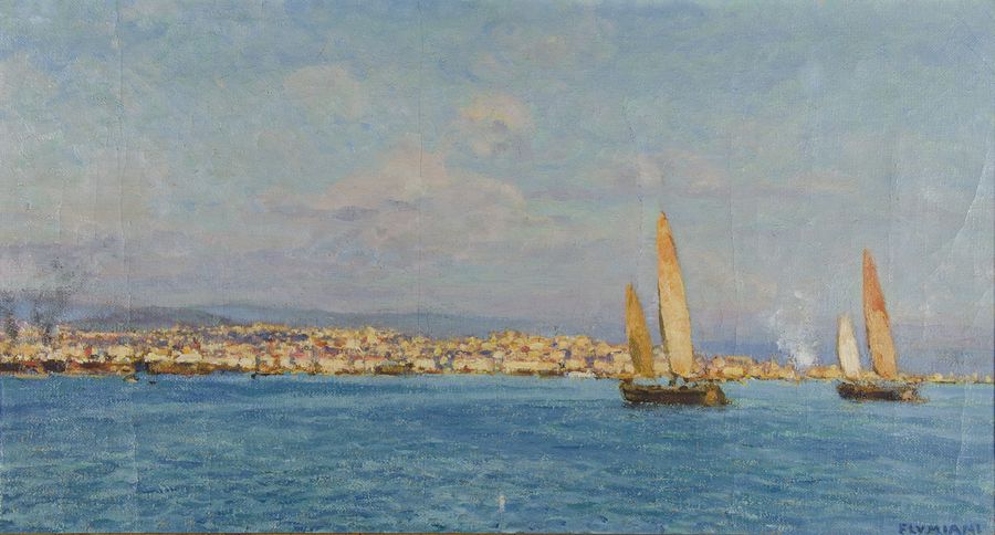 Ugo Flumiani Trieste 1876-1938 "Veduta dal mare" cm. 39x71 - olio su tela Firmato b. a d.
