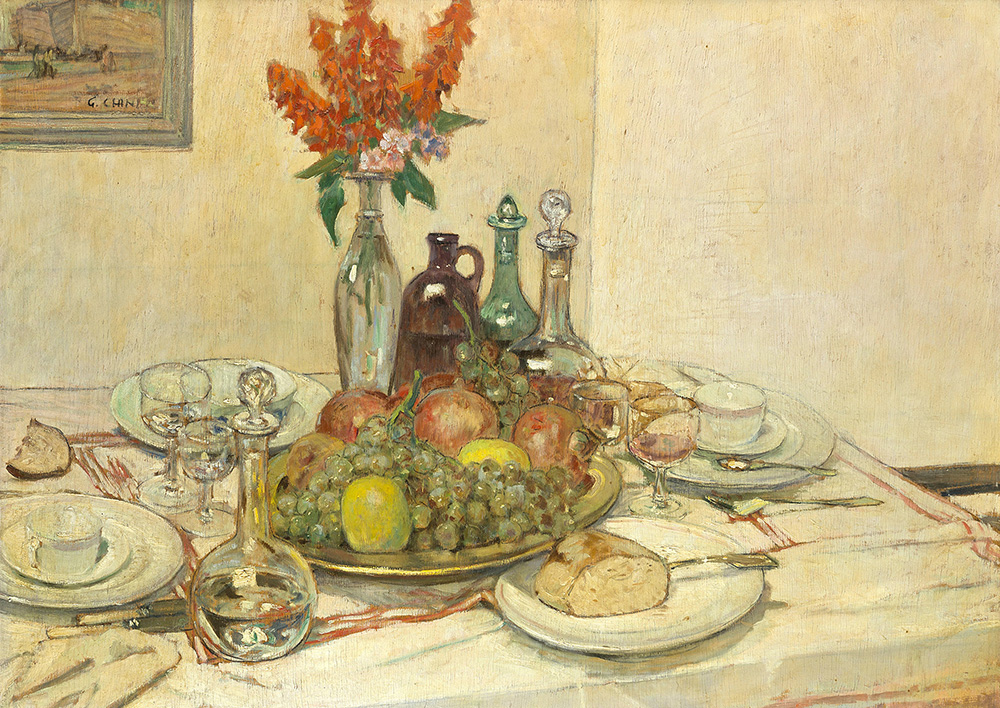 GALILEO CHINI (1873 - 1956) Tavola apparecchiata con fruttiera e fiori, 1933 ca