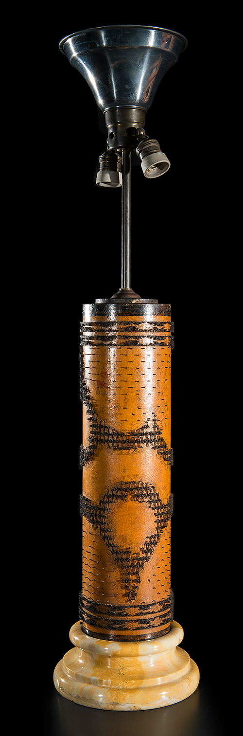 Francia, 1940 circa Lampada da tavolo Legno, matita, metallo 99x21x21 cm Esemplare di lampada in stile modernista, con decoro floreale disegnato a matita e in parte rilevato con chiodatura Il lotto arredava lo studiolo di Casa Rizzoli, dove era conservato con la selezione di disegni di Picasso ed altri oggetti di maestri del modernismo francese.