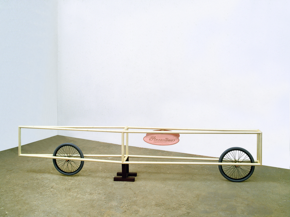 Gianni Piacentino YELLOW-IVORY PEARLESCENT FRAME VEHICLE WITH COPPER SIGNED PLATES 1 acciaio dipinto, lastra in ottone, gomma, mogano (sostegno) cm 60x300x30 Ruote: diametro 16" eseguito nel 1971 L’opera e` accompagnata da autentica dell’artista su fotografia e dalle note per montaggio e manutenzione redatte da Gianni Piacentino L’opera e` registrata nel Catalogo Generale Gianni Piacentino con il numero 161 Provenienza: Galleria Plura, Milano Collezione privata, Milano Esposizioni: Gianni Piacentino, Galleria Plura, Milano, aprile 1980 Gianni Piacentino. Painting and sculpture 1965 - 1981. Bilder und Objekte, Gesellschaft fur Aktuelle Kunst, GAK, Bremen, ottobre 1981, ivi ripr. pp.101