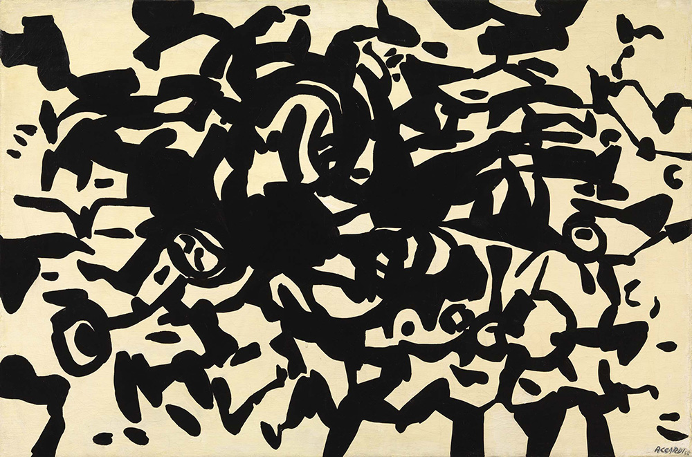 Carla Accardi Trapani 1924 - Roma 2014 Lotta di polipi, 1955 Caseina su tela, cm. 89x134,5 Firma e data in basso a destra: Accardi 55. Storia: Galleria Minini, Brescia; Collezione privata Esposizioni: Accardi, Roma, Galleria San Marco, 16 - 30 giugno 1956; Accardi, Milano, Galleria dell'Ariete, dal 4 ottobre 1957, cat. n. 1; Carla Accardi, New York, Haunch of Venison, 10 maggio - 26 giugno 2010; Roma 1960. The Dealer's Choice, Roma, Biblioteca Angelica, 18 maggio - 8 giugno 2012; A Roma. Obras della Colleción Farnesina, Città del Messico, Museo de Arte Carrillo Gil, 4 marzo - 31 dicembre 2013. Bibliografia: Carla Accardi, Modena, Galleria Civica, Palazzina dei Giardini, 26 febbraio - 13 aprile 1989, Cooptip, Modena, 1989, fig. 12; Germano Celant, Carla Accardi, Edizioni Charta, Milano, 1999, p. 249, n. 1955 1.