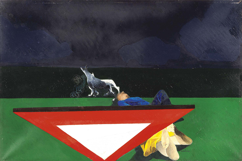 Ennio Calabria Tripoli 1937 Storia per una "coppia", 1976 Olio su tela, cm. 48x72,5 Firma in basso a destra: Calabria; firma, titolo e dichiarazione di autenticità al verso sulla tela: E. Calabria / Storia per una "coppia" / Opera mia autentica / Ennio Calabria 76: timbro Galleria G. Cesare, Rimini. Foto autenticata dall'artista in data 78.